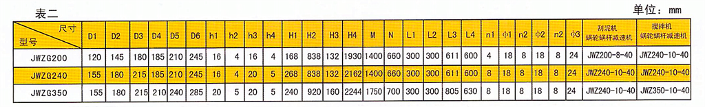 JWZ澄清池刮泥機專用蝸輪蝸桿減速機規格主要有JWZ200\JWZ2410\JWZ350\JWZ460等,根據澄清池大小選擇合適的蝸輪箱。以下數據僅供參考: