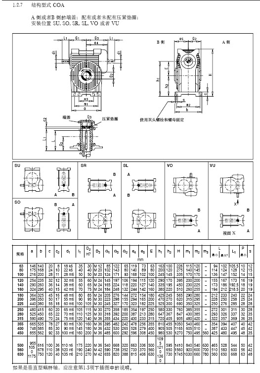 COA蝸輪蝸桿減速機(jī)安裝形式為蝸桿上置式,蝸輪為孔輸出。傳動(dòng)比多樣,中心距63-630mm,具體中心距分一下幾種:
