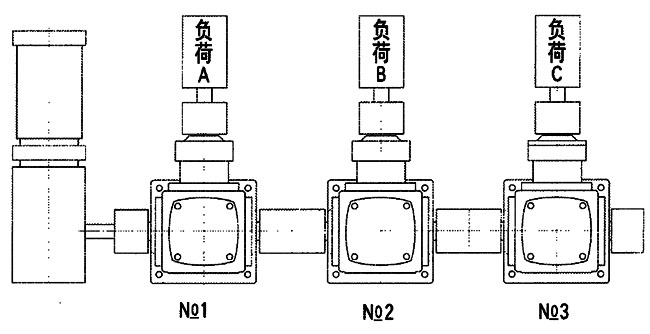 ※1號減速器  因1號減速器本身的負載為245N·m,而2、3號減速器需通過1號減速器傳遞扭矩。所以1號減速器應承擔的負載為:245N·m+245N·m+245N·m=735N·m,依據傳動能力表,應選AT12。