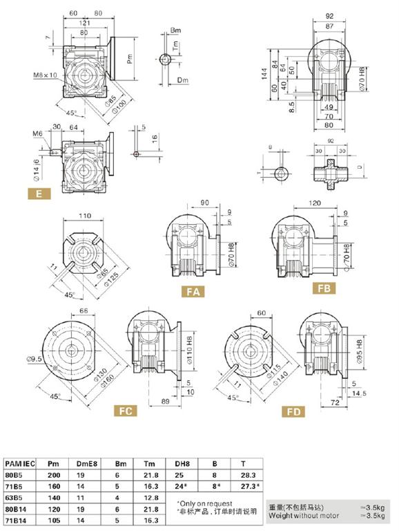 型號:025 030 040 050 063 075 090 105 110 130 150其中025-105為鋁合金外殼,110-150為鑄鐵外殼;減速比:1/5 1/7.5 1/10 1/15 1/20 1/30 1/40 1/50 1/60 1/80 1/100,其組合減速比可高達1/5000.