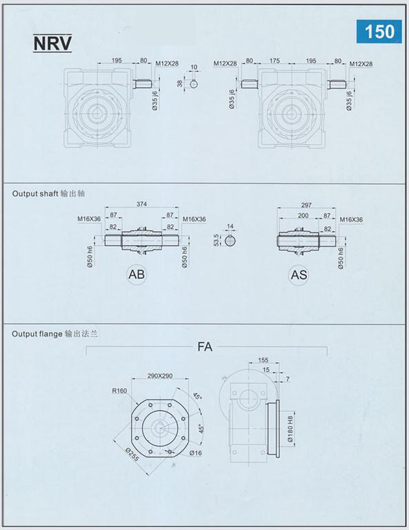 NMRV/RV150型蝸輪蝸桿減速機中心距150mm,同其他RV系列減速機相同,可軸輸入、法蘭輸入、法蘭輸出、軸輸出等多種方式。