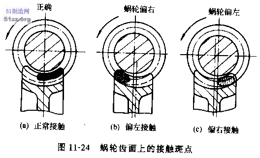 蝸輪齒面上的接觸斑點應在中部稍偏蝸桿旋出方向,如圖11—27a所示,若出現圖11—23b、圖11—23c的接觸情況,應配磨墊付片調整蝸桿位置使用權其達到正常接觸。接觸斑點長度,輕負荷時一般為齒寬的25%~50%,不符合要求時,可適當調節蝸桿座徑向位置。全負荷時接觸斑點長度最好能達到齒寬的90%以上。